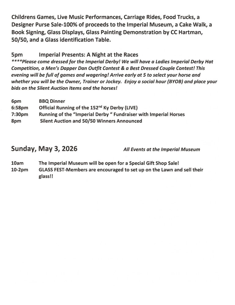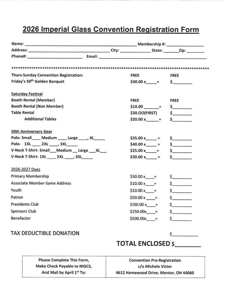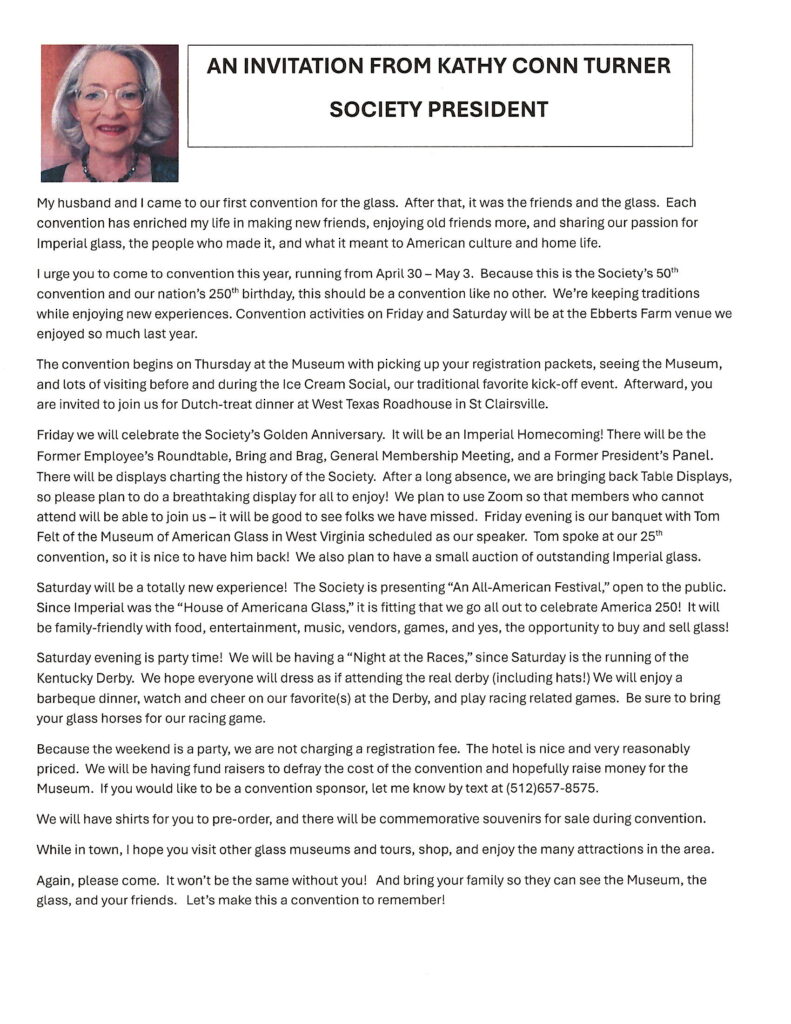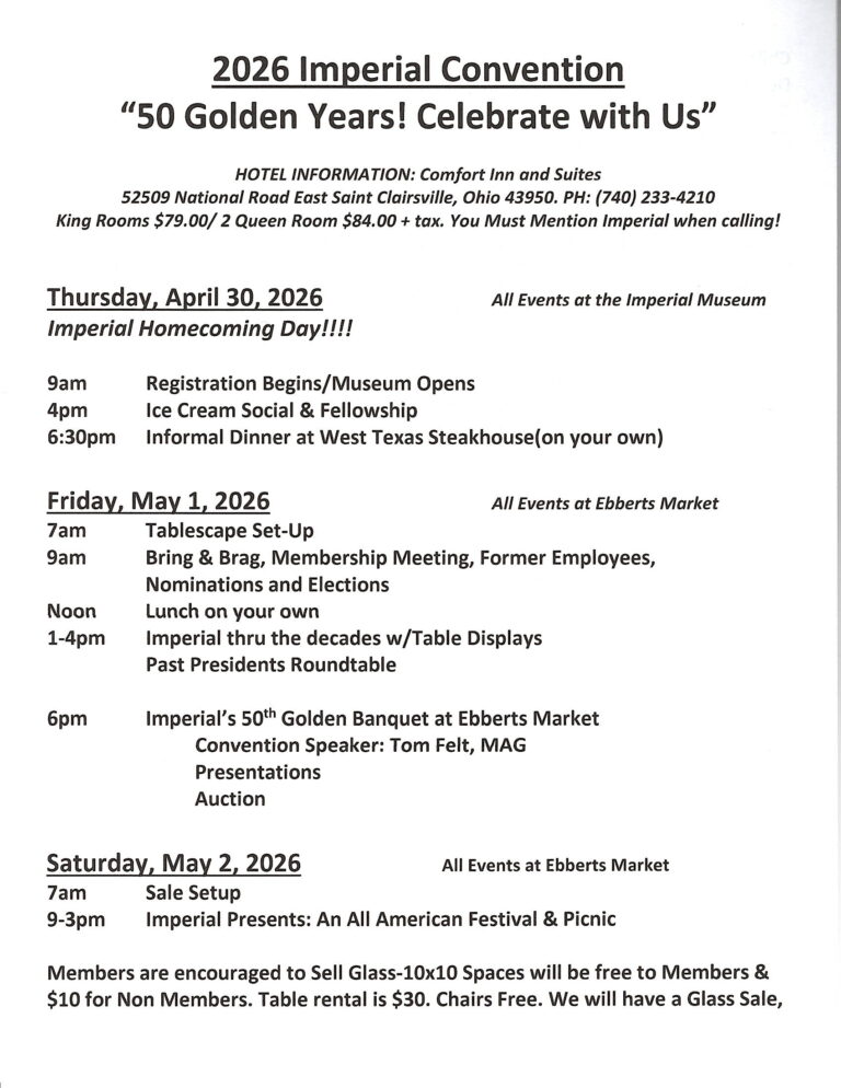 Save the dates….April 30th-May 3rd 2026. the 50th Golden Convention of the National Imperial Glass Collectors Society. The theme is “An Imperial Homecoming” and we woild like EVERY Society Member, Former Employee, and Glass collector to attend. Registration is FREE, and the Banquet costs $40.00 per person. And YES Everyone will have an opportunity to sell Glass, or anything you collect on Saturday at our huge Glass Sale all day. Including at least one Glass Auction during Convention. We are also bringing back a Tablescapes Competition, so start your designs now!